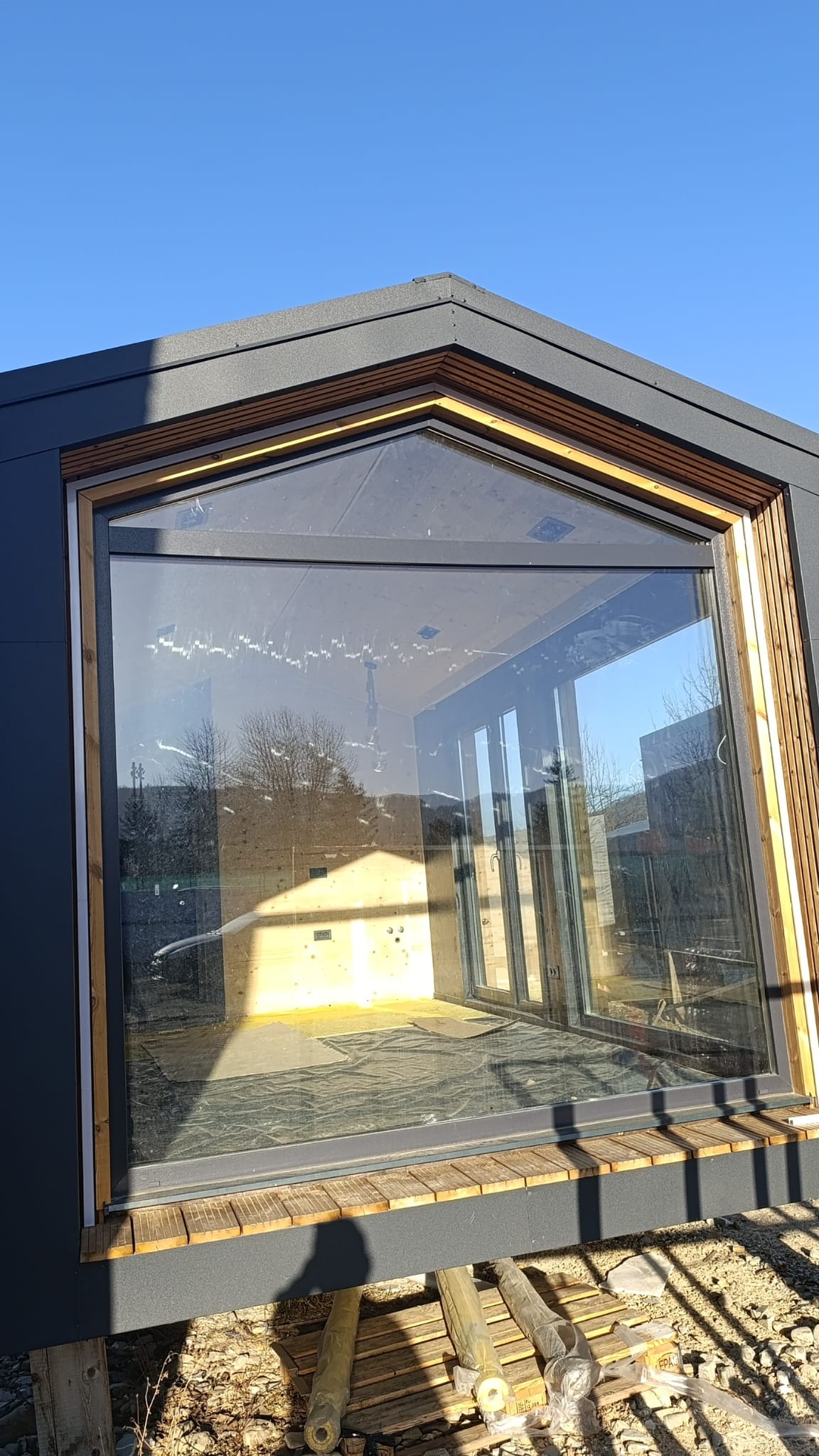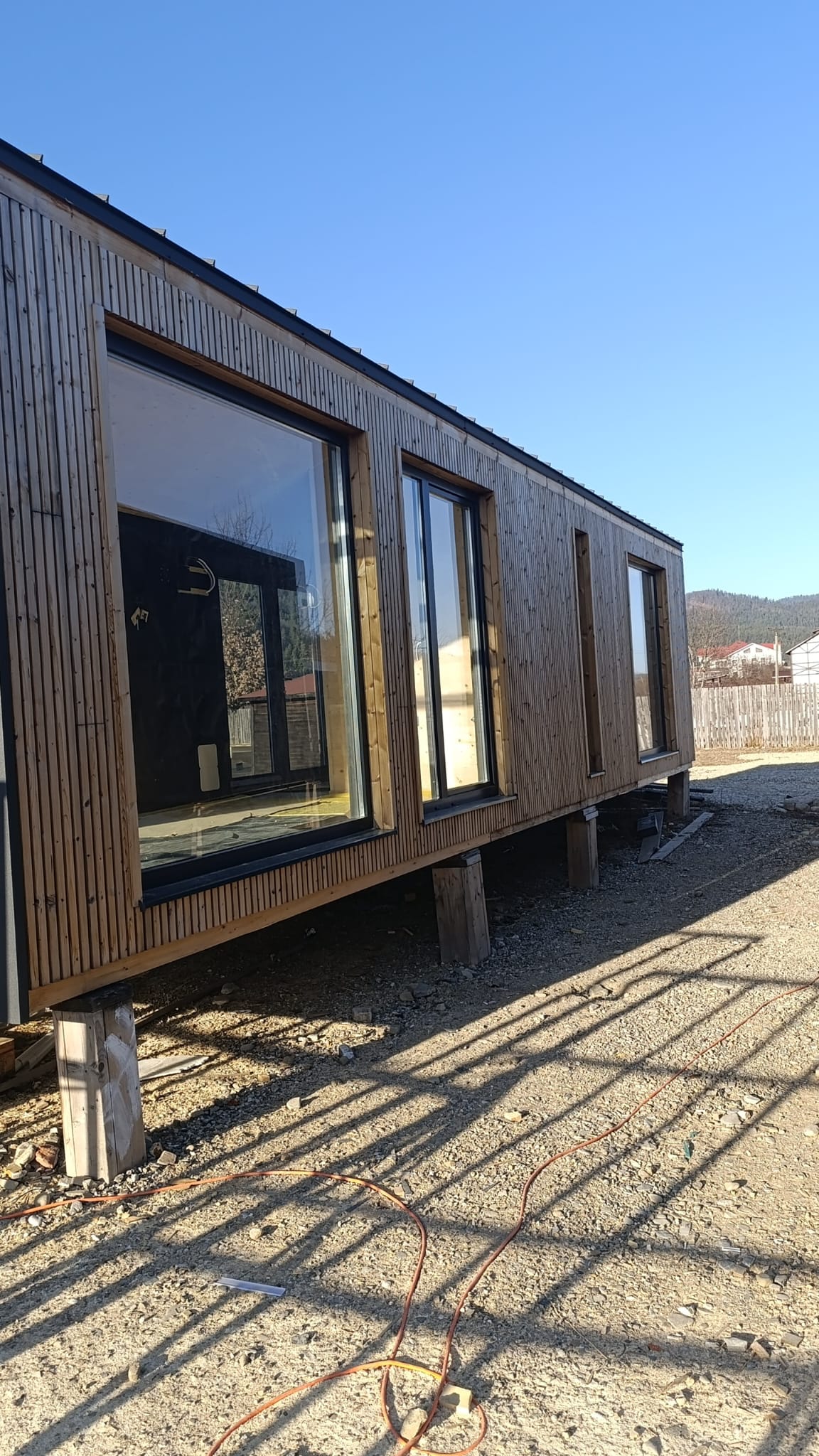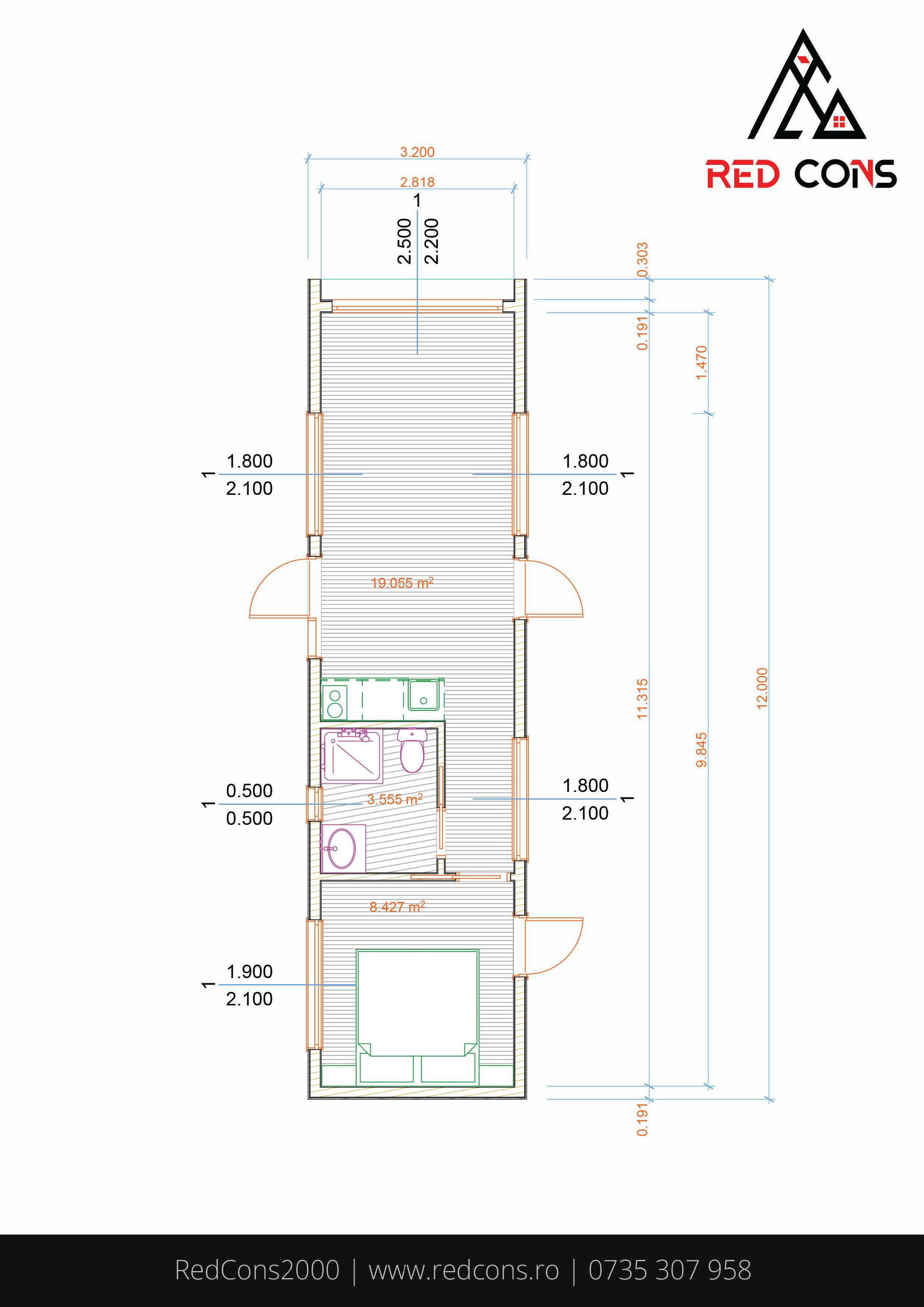Dimensiuni Suprafață: 38.20 m² Lungime: 12.00 m Lățime: 3.20 m Înălțime: 3.50 m Structura perete Lambriu interior pin nordic Membrană anticondens Structură lemn Izolație vată bazaltică Membrană exterior Dublu sistem de șipci (vertical + orizontal) Tablă click exterior Dotări principale ● Structură lemn masiv ● Izolație vată bazaltică ● Lambriu pin nordic interior ● Baie complet echipată ● Încălzire în pardoseală ● Instalație electrică completă