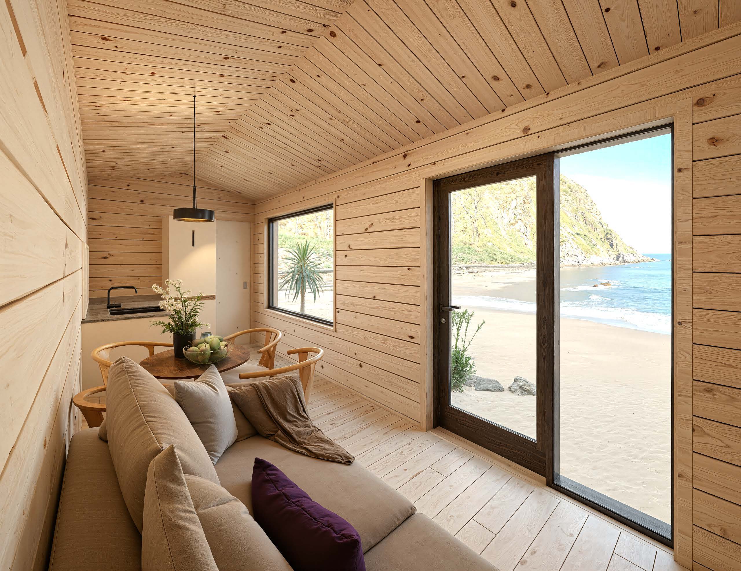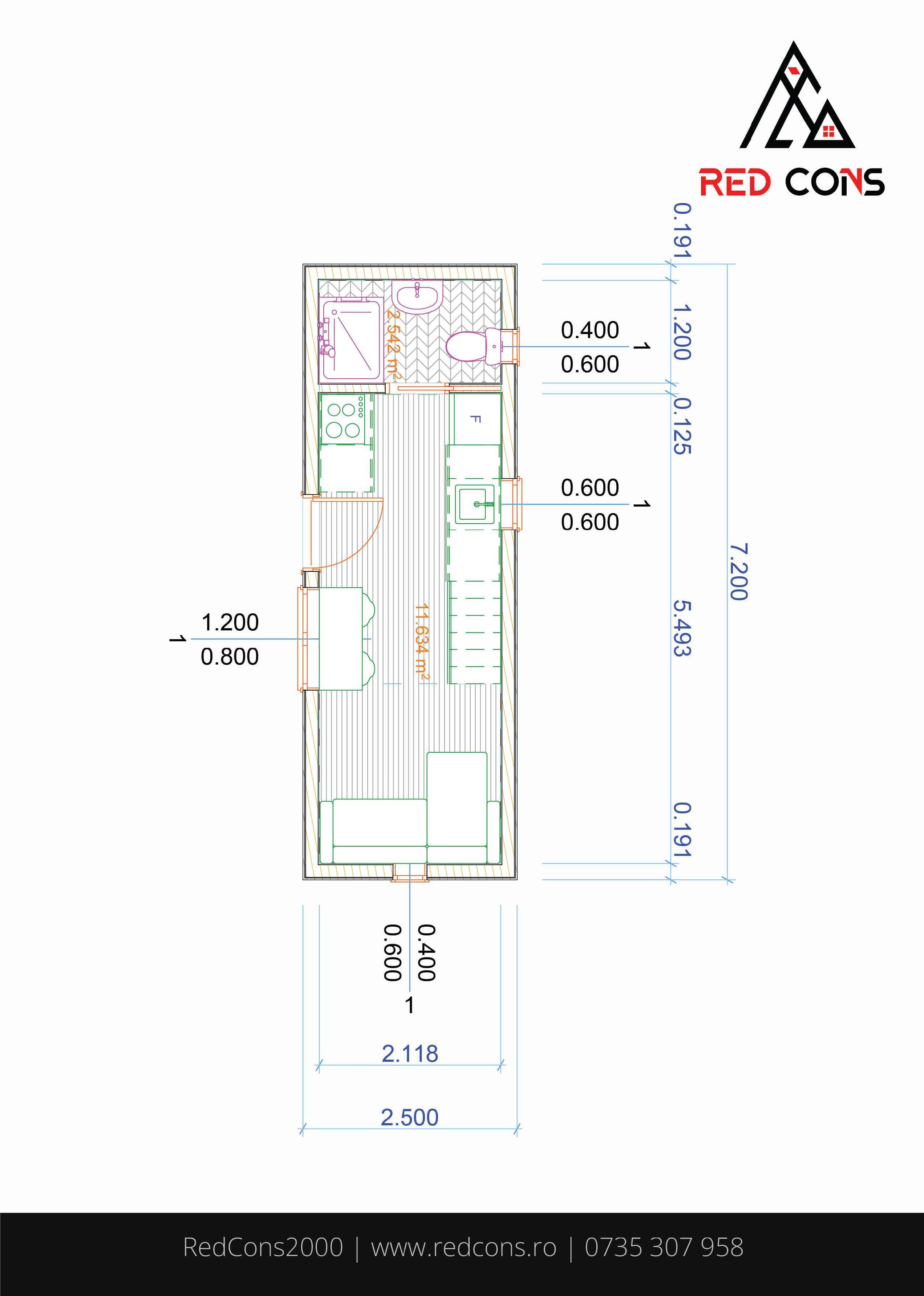 Dimensiuni Suprafață: 25.50 m² Lungime: 10.20 m Lățime: 2.50 m Înălțime: 3.20 m Structura perete Lambriu interior pin nordic Membrană anticondens Structură lemn Izolație vată bazaltică Membrană exterior Dublu sistem de șipci (vertical + orizontal) Tablă click exterior Dotări principale ● Structură lemn masiv ● Izolație vată bazaltică ● Lambriu pin nordic interior ● Baie complet echipată ● Încălzire în pardoseală ● Instalație electrică completă