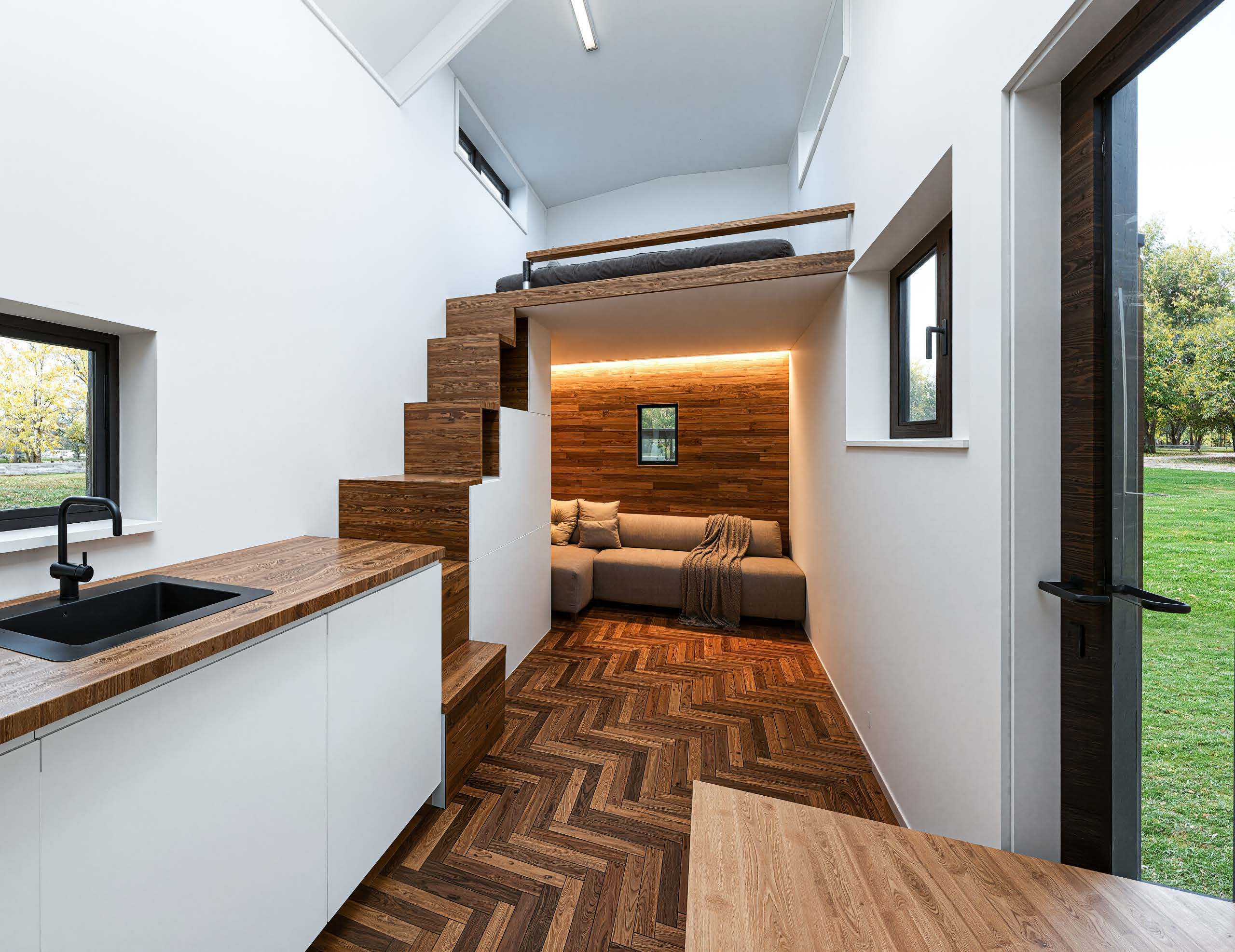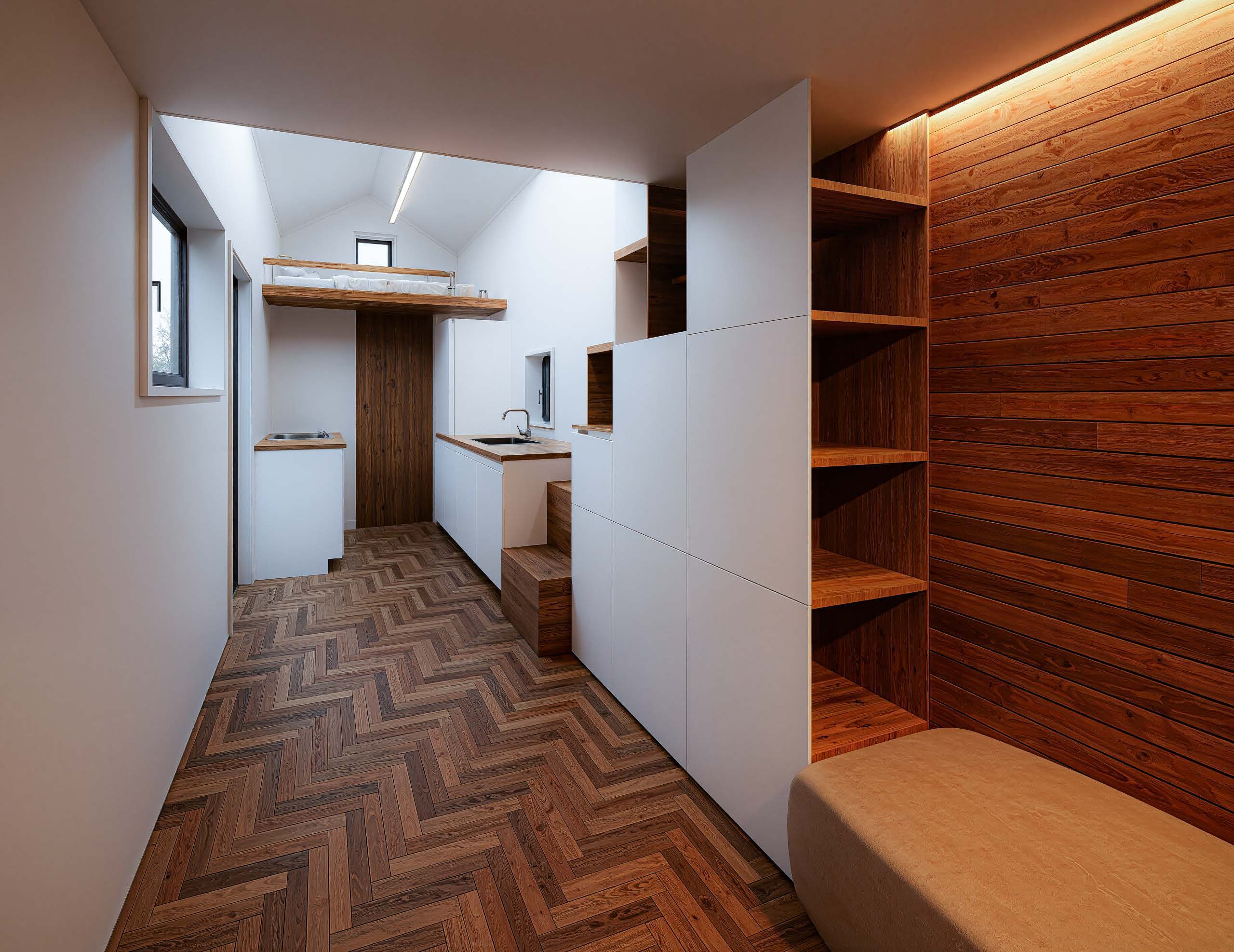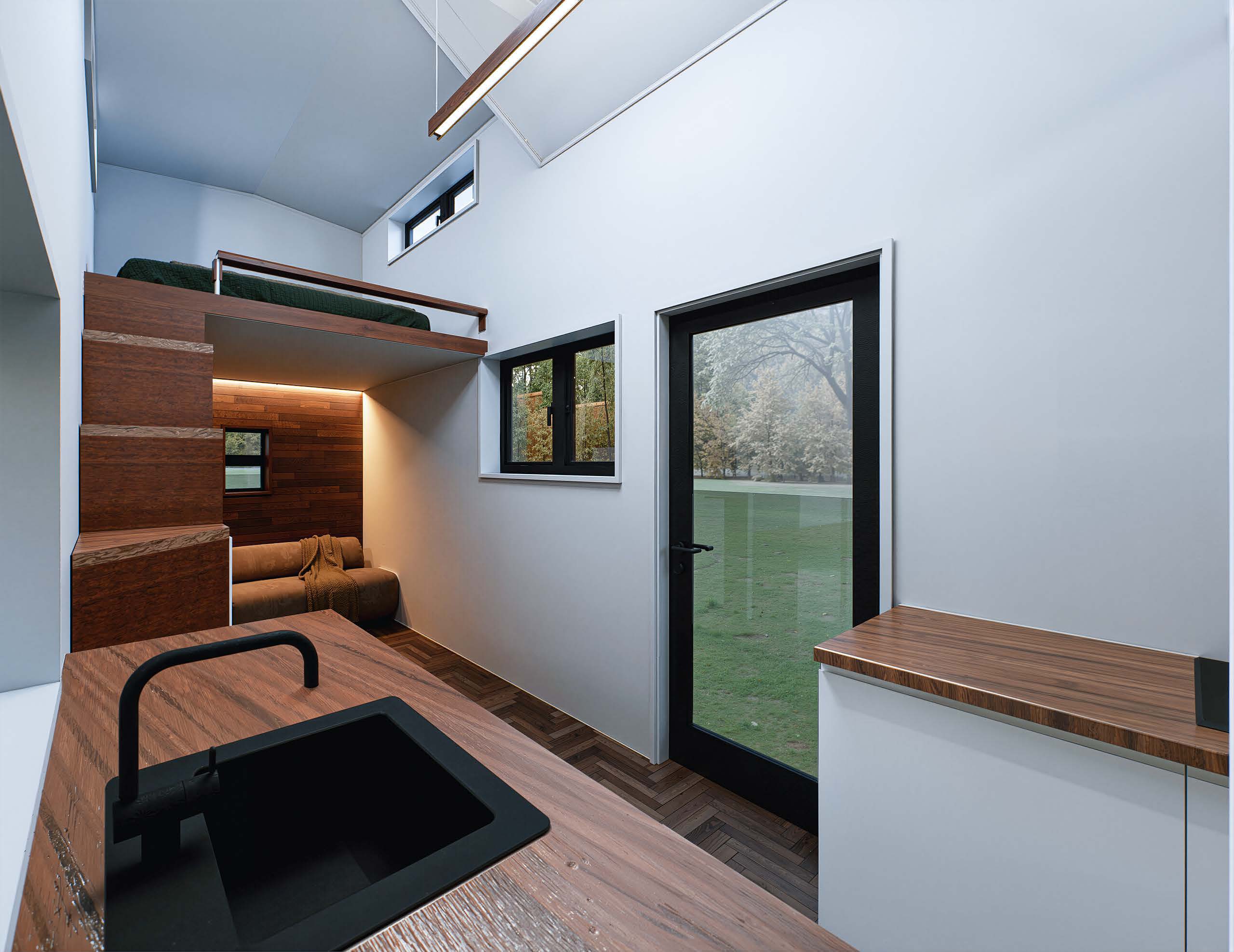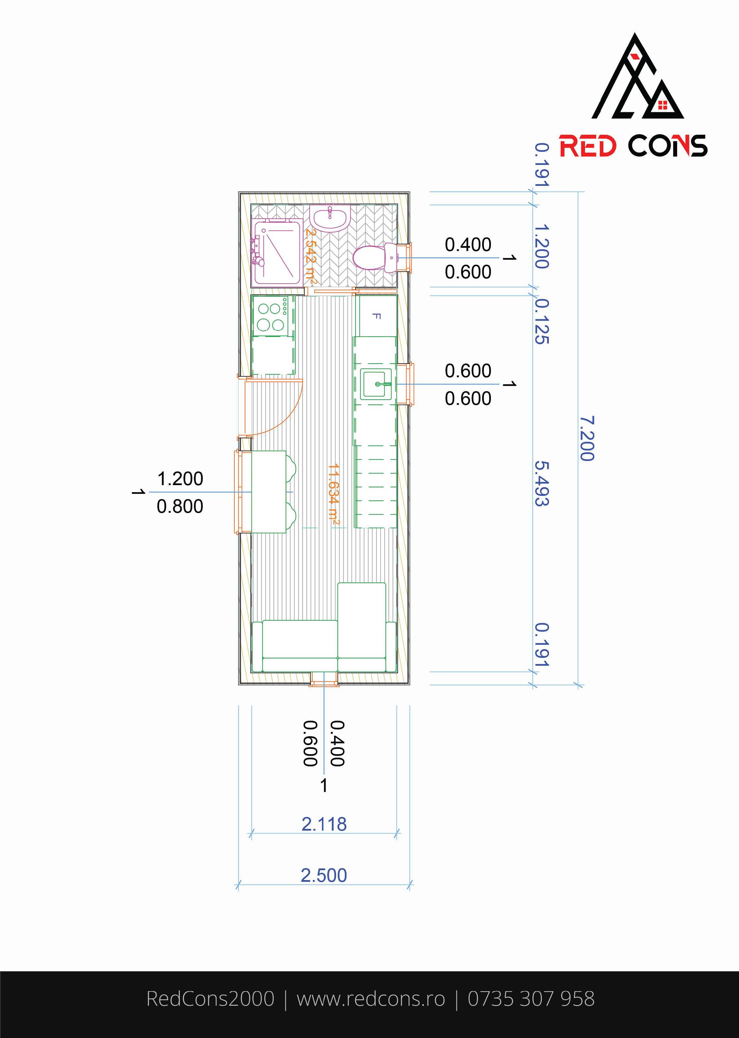 Dimensiuni Suprafață: 26.20 m² Lungime: 8.20 m Lățime: 3.20 m Înălțime: 4.00 m Structura perete Lambriu interior pin nordic Membrană anticondens Structură lemn Izolație vată bazaltică Membrană exterior Dublu sistem de șipci (vertical + orizontal) Tablă click exterior Dotări principale ● Structură lemn masiv ● Izolație vată bazaltică ● Lambriu pin nordic interior ● Baie complet echipată ● Încălzire în pardoseală ● Instalație electrică completă