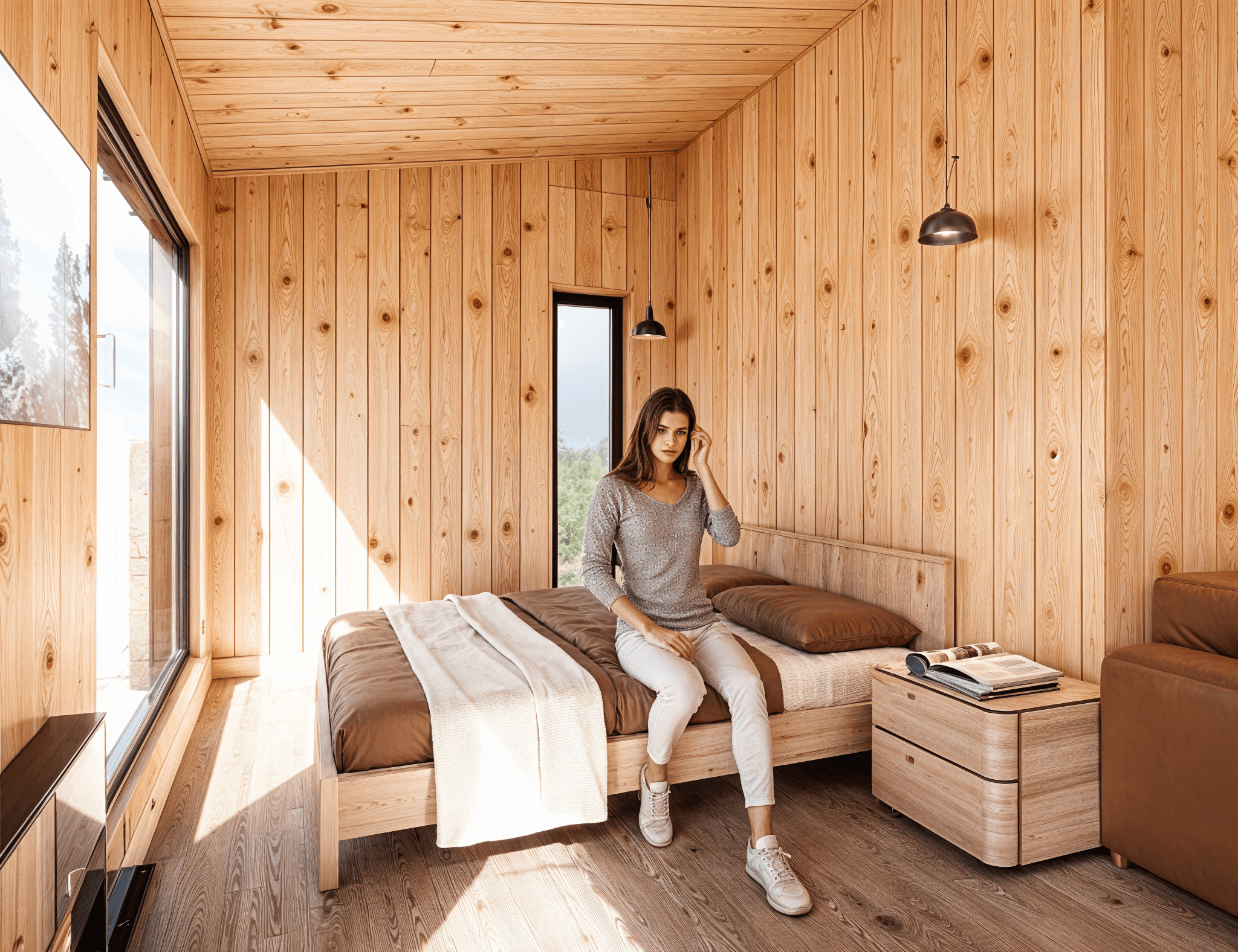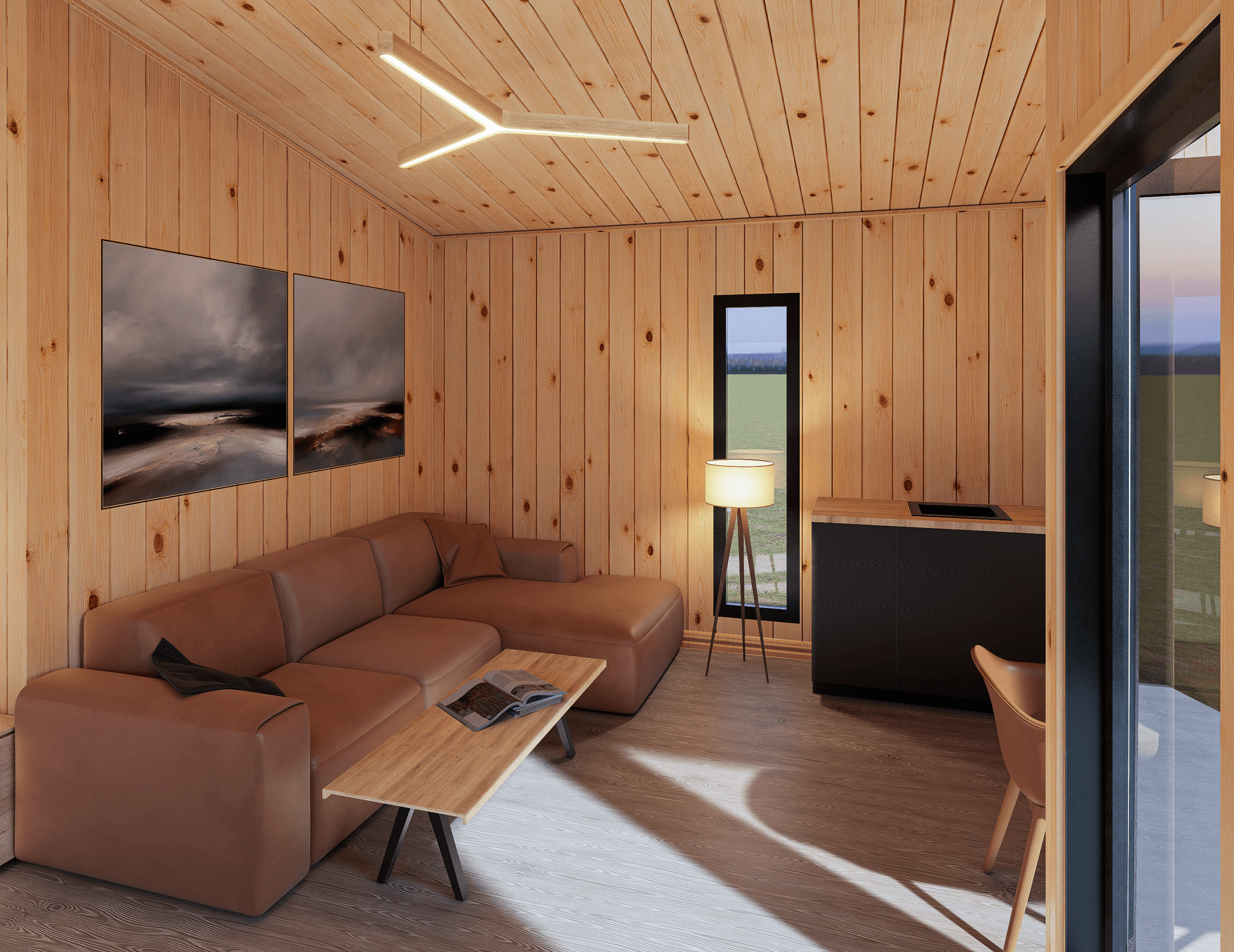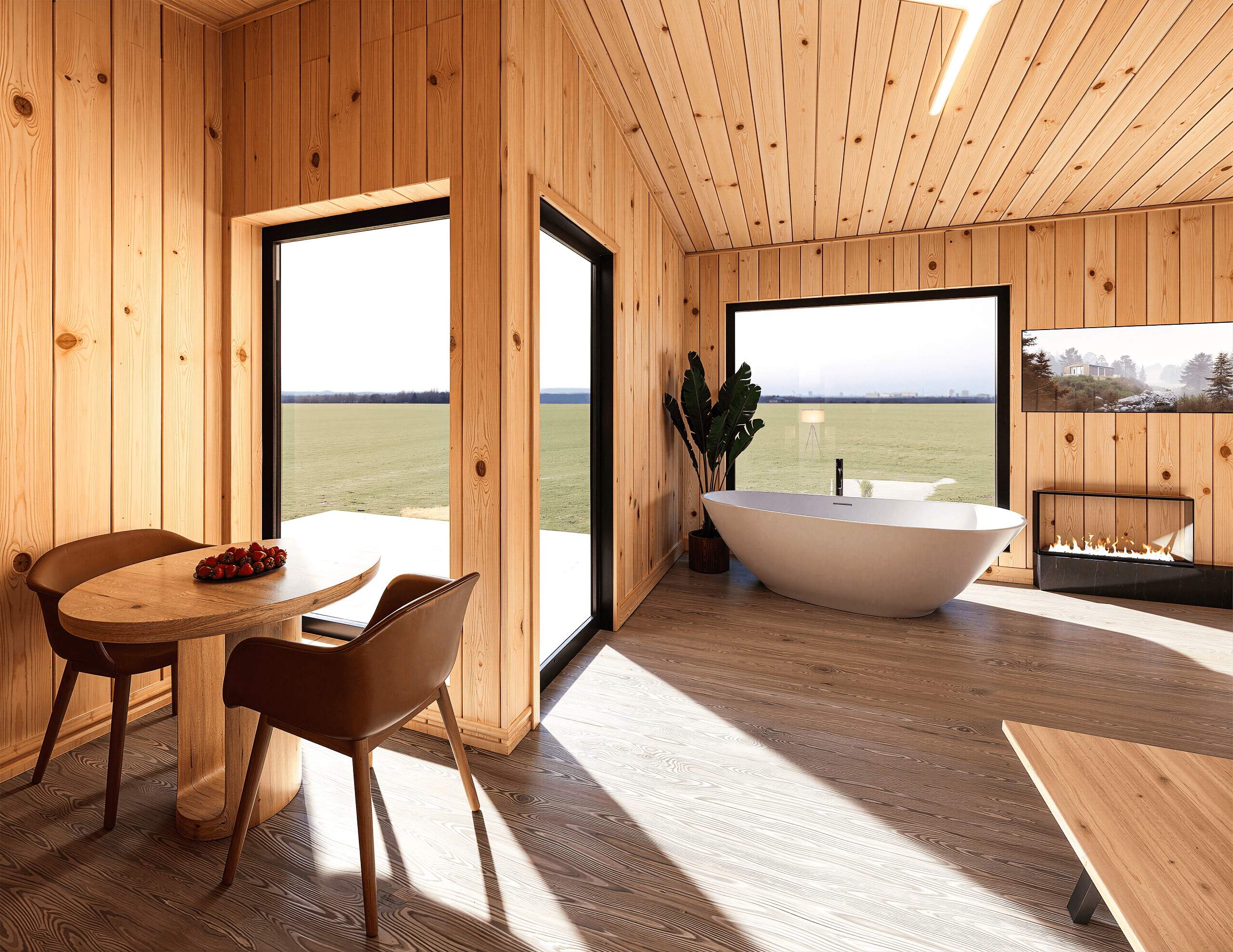 Evadează din cotidian cu Tiny Fulger, o casă modulară modernă, proiectată pentru iubitorii de natură care nu vor să facă compromisuri la confort. Cu un exterior îndrăzneț ce combină lemnul natur cu accente negre moderne și suprafețe vitrate generoase, această casă captează lumina naturală din toate unghiurile. Interiorul este un open-space cald, placat integral cu lemn, ce include un living spațios, un dormitor aerisit și o baie spectaculoasă cu cadă freestanding și finisaje din piatră. Izolată perfect pentru ierni grele și veri toride, Tiny Fulger este refugiul tău "la cheie", gata să fie amplasat oriunde visezi.